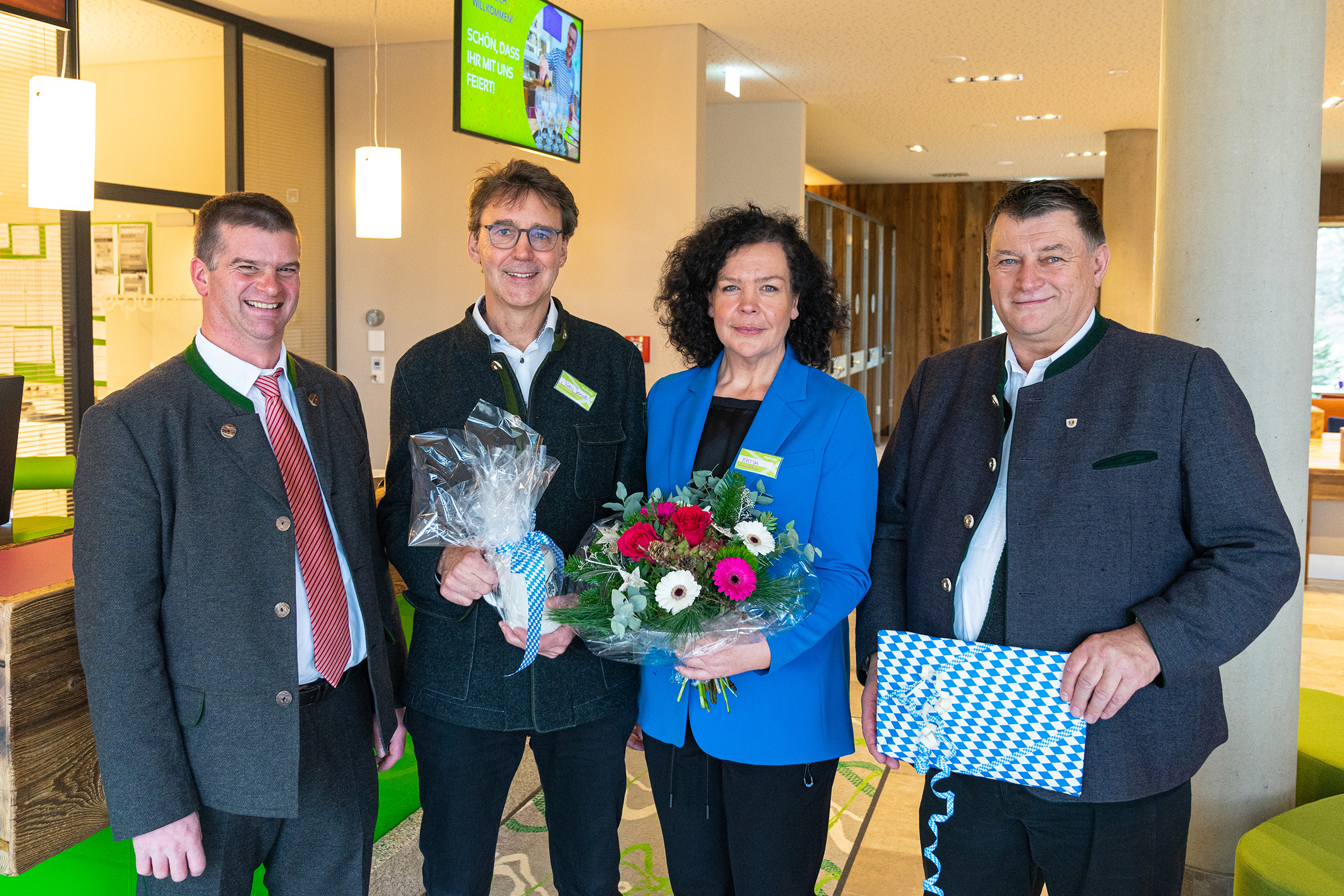 Christian Hornsteiner, Bürgermeister Farchant (links) und Anton Speer, Landrat Landkreis Garmisch-Partenkirchen (rechts), beglückwünschen Jürnjakob Reisigl und Katja Leveringhaus zur Eröffnung.